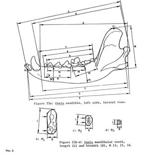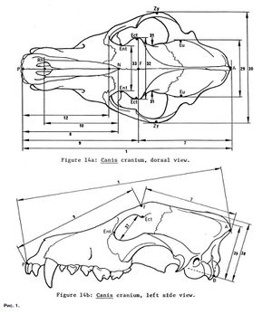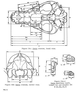 Диагноз. Относительно мелкий в сравнении с обычным Canis lupus волк, обладавший рядом своеобразных признаков. В частности, по 11 параметрам верхней челюсти и 4 нижней существенно удаляется в меньшую сторону от серых волков (рис. 7). Такое же отличие имеет и формат черепа равный 58,3 %; у серых волков соответственно 62,98–67,46 %. Объем головного мозга – 115 мл, против такового у ископаемых C. lupus – 148–180 мл. Клыки и премоляры на верхней и нижней челюстях заметно уплощены.